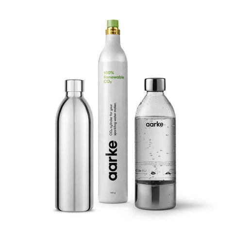 Zum Sortiment gehören vor allem Wassersprudler wie der Carbonator 3 und der Carbonator Pro. Der Carbonator 3 ist ein manuell betriebener Sprudler mit Edelstahlgehäuse, der ohne Strom funktioniert. Der Carbonator Pro ist eine Weiterentwicklung mit Glasflasche, Push-to-Lock-System und spülmaschinenfestem Zubehör – ideal für designbewusste Haushalte. Beide Geräte funktionieren mit standardisierten CO₂-Zylindern (60 Liter, Schraubgewinde), Aarke bietet hier auch eigene Zylinder mit 100 % biogenem CO₂ aus Europa an.