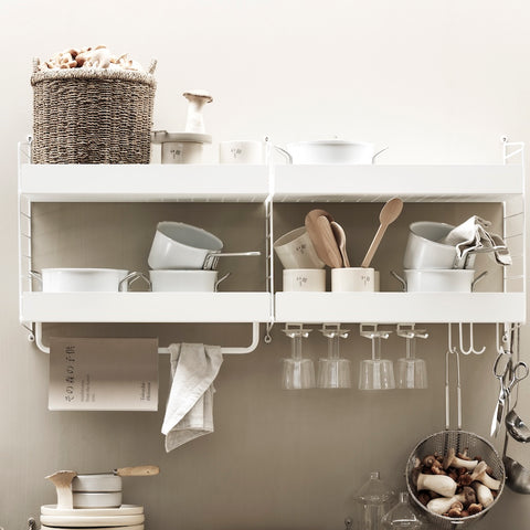Die Schienen sind mit allen Regalböden aus Metall kompatibel und können in deren Lochung befestigt werden. Besonders in der Küche bieten sie strukturierte Ordnung, während sie zum Beispiel Gläser oder Geschirrtücher in Szene setzen.