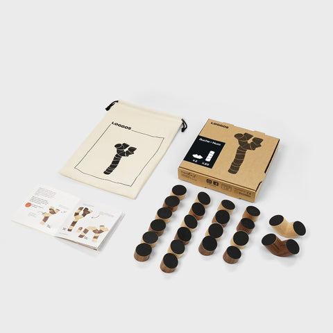 Loggos ist Designobjekt und kreatives Motorikspiel in einem. Das besondere Stapelspiel wird in Deutschland handgefertigt und besteht aus edlem, zertifiziertem Nussbaum- und Buchenholz. Die Bausteine sind mit rutschfester Grip-Folie ausgestattet, sodass selbst anspruchsvolle Konstruktionen stabil bleiben – ganz ohne Magnete. Als pädagogisches Holzspielzeug fördert Loggos spielerisch Konzentration, Kreativität und Feinmotorik und sorgt für generationenübergreifenden Spielspaß für Kinder und Erwachsene. Nachhaltig produziert in inklusiven Werkstätten in Stuttgart und komplett plastikfrei.