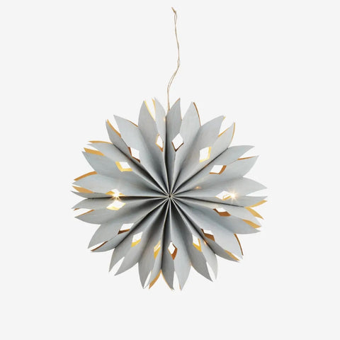 Der Veneer-Papierstern mit Lichtern von Madam Stoltz kombiniert zartes Design mit integrierter Beleuchtung für stimmungsvolle Dekoration. Dieser Papierstern eignet sich ideal zum Aufhängen an Fenstern oder Wänden und bringt ein warmes Leuchten in die winterliche Umgebung.